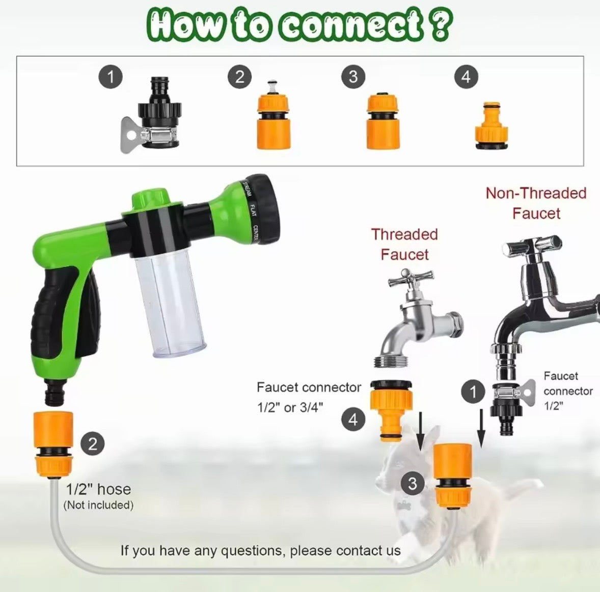Make pet bathing and cleaning easier than ever! This high-pressure sprayer comes with 8 nozzle modes for versatile use—perfect for pet showers, car washes, garden watering, and more. The built-in soap dispenser with adjustable foam levels ensures deep cleaning, while the grooming brush provides a gentle massage for a stress-free bath. Easy to connect with 4 universal faucet adapters, it works with most hoses and water pressures (up to 116 psi). Durable, lightweight, and convenient—your all-in-one cleaning tool!